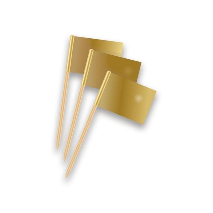 Prikkers goud. 50 stuks prikkertjes goud voor je feesthapjes. De prikkertjes met gouden vlaggetjes zijn mat goud. Een standaard prikker van formaat